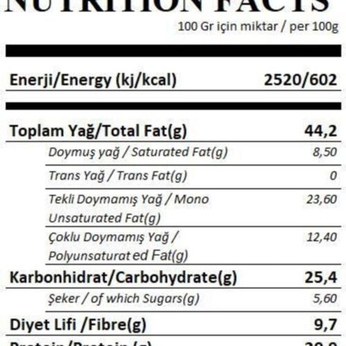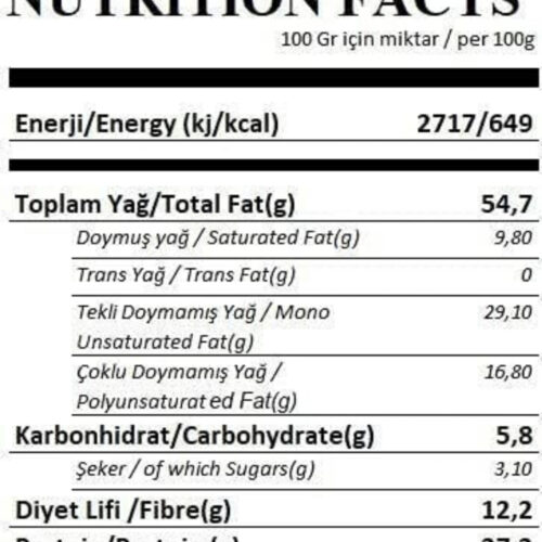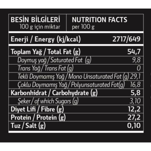 %100 yer fıstığı, 100 gr.; Da 27 gr.; ; Protein içerir.; ; Içindekiler: %100 yer fıstığı.; ; Alerjen bilgisi: yer fıstığı içerir.; ; Eser miktarda fındık içerebilir.; ; Ürün özel bilgileri: Ürün üzerinde yağ ayrışması doğaldır.; ; Tüketmeden önce karıştırınız.; ; serin ve kuru ortamda muhafaza ediniz.; ; Doğal olarak şeker içerir.; ; Türk gıda kodeksine uygun üretilmiştir.;
