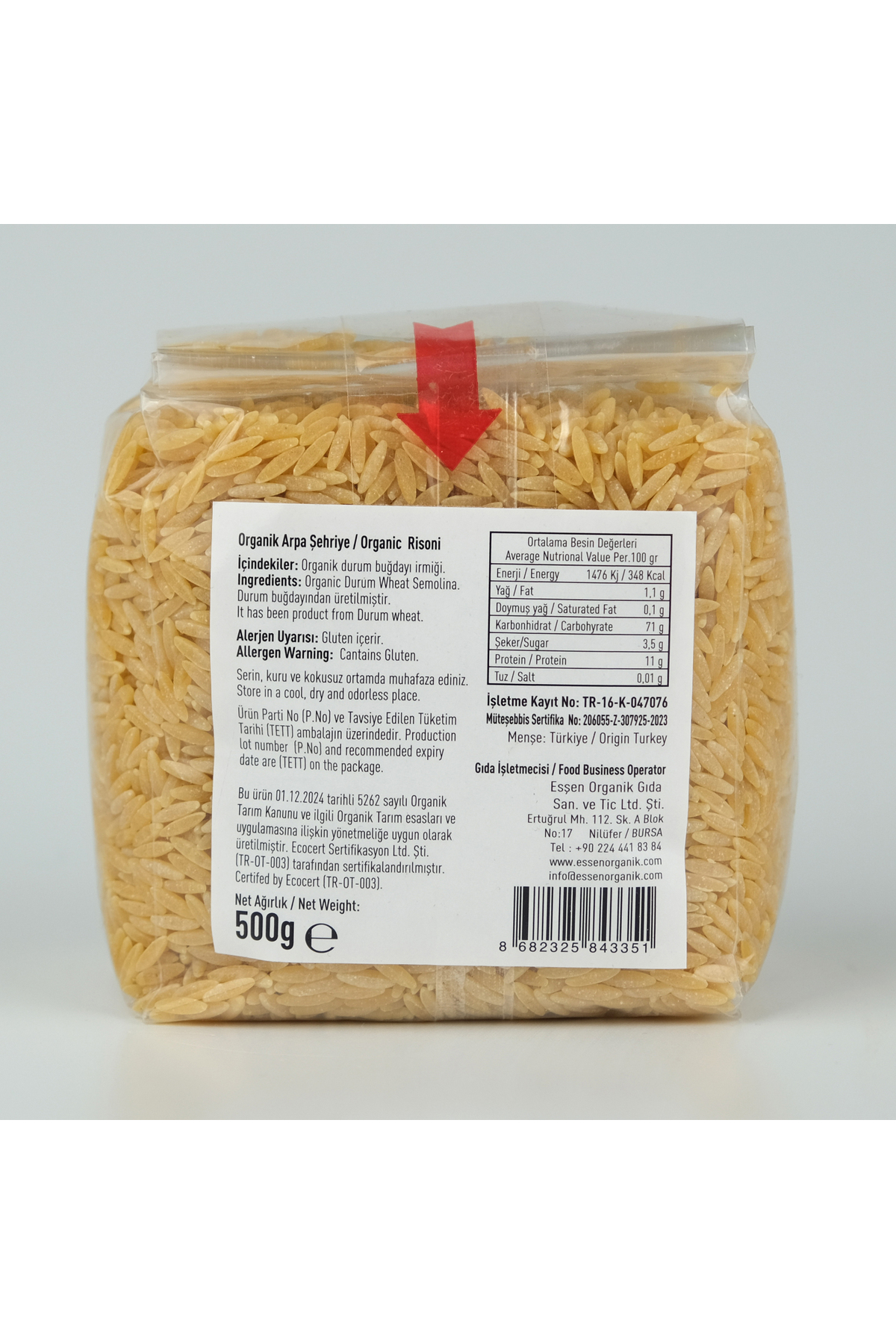 Organik Arpa Şehriye; Organik durum buğdayından üretilmiştir.; ; Net Ağırlık: 500 gr; Organik tarım insan sağlığına ve çevreye zarar vermeyen ve üretimde kimyasal girdi kullanılmadan, üretimden tüketime kadar her aşaması kontrollü ve sertifikalı tarımsal üretim biçimidir.; ; Bu ürün T.; C.; 5262 sayılı organik Tarım Kanunu ve ilgili organik Tarım Esasları ve uygulamasına ilişkin yönetmeliğe uygun olarak üretilmiştir.; ; Ecocert Sertifikalı;