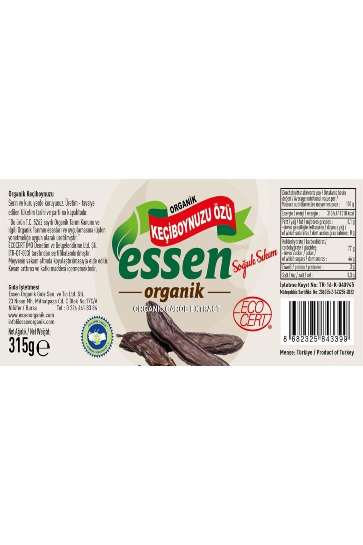 Organik keçiboynuzu özü ; Net ağırlık: 315 gram; Sağlıklı cam ambalaj ; Soğuk sıkım ; Meyvenin vakum altında koyulaştırılmasıyla elde edilir.; ; Organik tarım insan sağlığına ve çevreye zarar vermeyen ve üretimde kimyasal girdi kullanılmadan, üretimden tüketime kadar her aşaması kontrollü ve sertifikalı tarımsal üretim biçimidir.; ; Ecocert Sertifikalı ; Yerli Üretim;