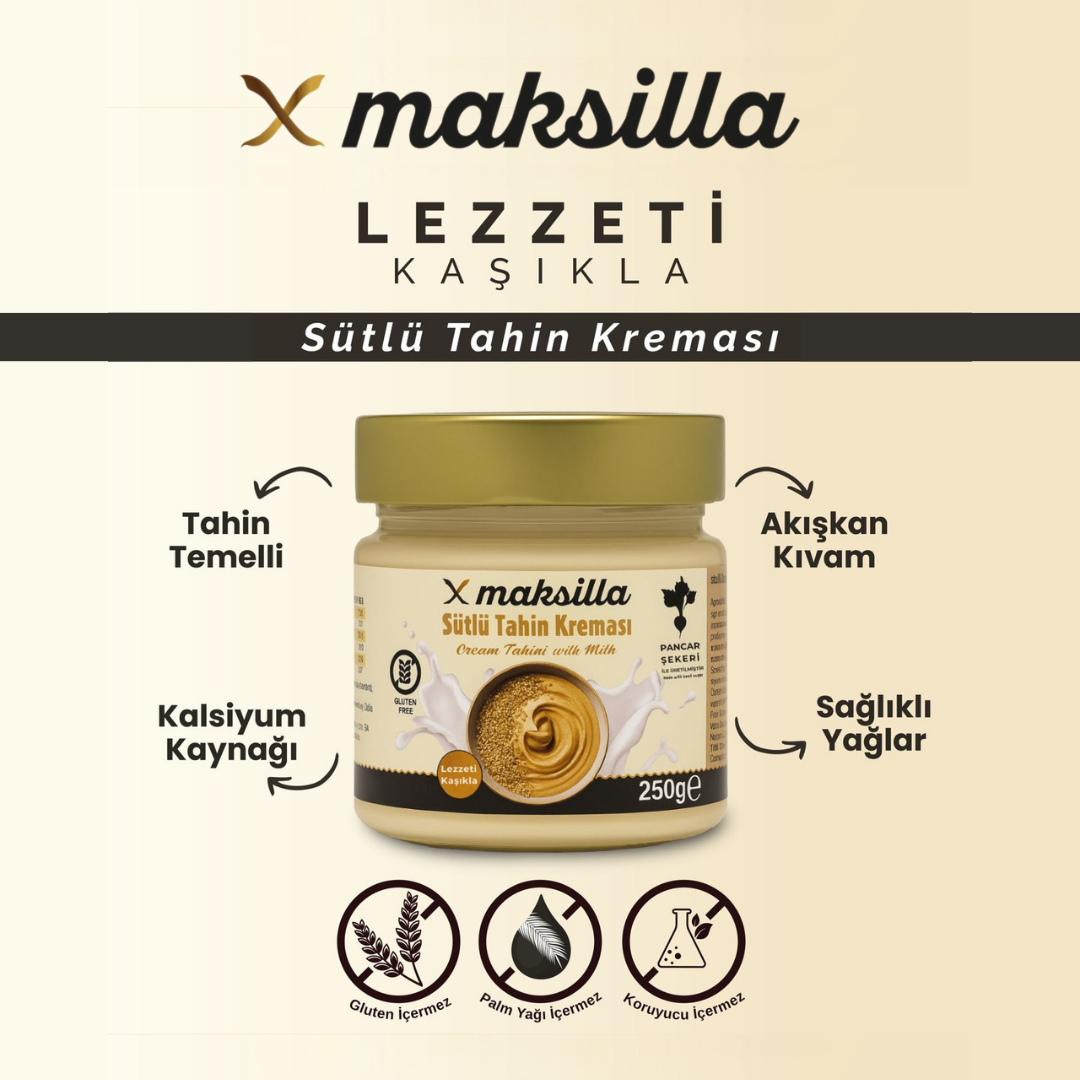 Maksilla Sütlü Tahin Kreması; %100 susamdan üretilen tahin, pancar şekeri, süt türevleri gibi doğal içeriklerin özenle karıştırılmasıyla elde edilir.